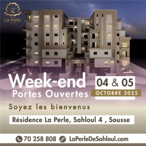 Alors venez visiter notre nouveau projet, Résidence La PERLE, situé à Sahloul 4, Sousse à l’occasion du weekend portes ouvertes.